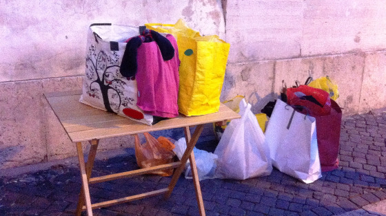 A piazza SS. Apostoli, subito dietro il Foro di Traiano, ci affianchiamo al gruppo della Ronda, che ormai da anni distribuisce cibo nella zona del centro storico, distribuendo i vestiti (prima selezionati e catalogati) ai nostri assistiti: i senzatetto di Roma!